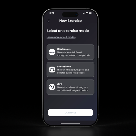 With three different BFR modes — continuous, intermittent, and resting — you can match your fitness level and goals for the most comfortable and effective training experience.